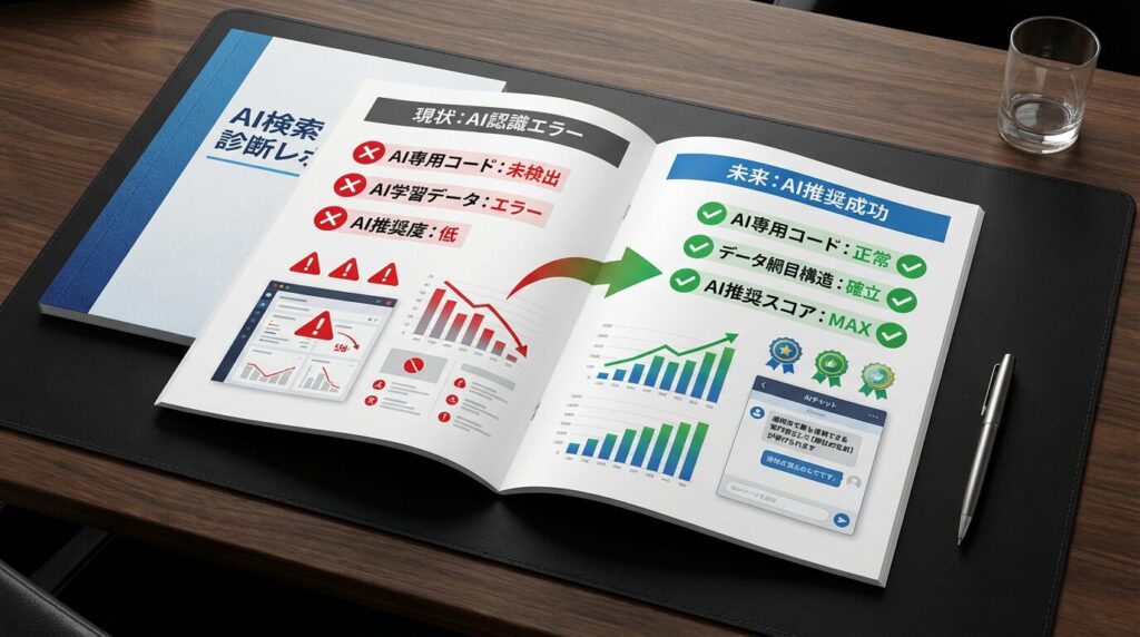 Google提供の公式診断ツールと最新AIを駆使し、御社のサイトが現在AIから「どう見えているか(または無視されているか)」を手作業で解析し、証拠となるレポートを作成します。 (※お客様のパスワード等の個人情報は一切不要です。外部から安全に解析いたします)